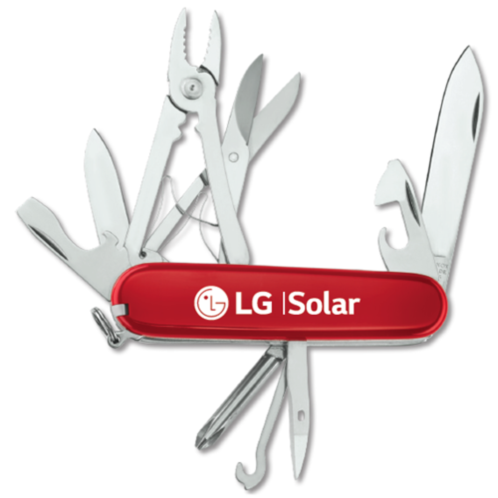 sku: Life231* Compact size easily tucks in pocket or purse * 17 functions including large blade, small blade, can opener, file, multi function pliers, much more * Durable, stainless steel blades carry a lifetime warranty * LG imprint printed on body * Size: 3 1/2"L closed