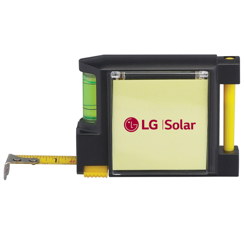 sku: Life24910-foot retractable, locking tape measure. Built-in level. Includes 1-3/4" x 1-3/4" yellow sticky memo pad, mini pen and metal belt clip. Locking button on bottom of item keeps tape in place. Clear flip-top cover protects memopad.